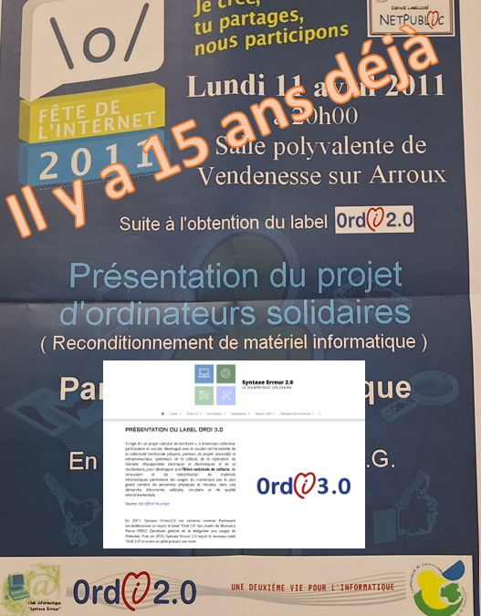Après avoir fêter les plus de 40 ans de son histoire, notre Association Syntaxe Erreur 2.0 Gueugnon, acteur du Numérique Solidaire, de l’Economie Circulaire dans le cadre de l’Economie Sociale et Solidaire, nous allons fêter les 15 ans de l’obtention du label national Ordi 2.0. (devenu Ordi 3.0)